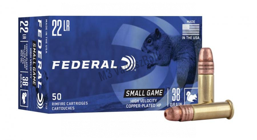 Federal Small Game CopperPlated HP .22LR 38gr - Kiskaliberű lőszer, kistestű vadak meglövésére. Pontossága kiemelkedő, teljesítménye megbízható, valóban kimeríti kategóriájának lehetőségeit. A fúrt, réz bevonatú ólommag kiváló ballisztikai tulajdonságokat és irányított, egyenletes gombásodást biztosít.