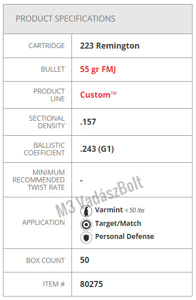 223 Rem. FMJ 55gr 3.6 - első sorban rendvédelmi szervek számára készült, közepes teljesítményű, teljes köpenyes lőszer, gyakorlásra. Gazdaságos árának és jó ballisztikai tulajdonságának köszönhetően kitűnő választás a lövészet gyakorlatának elmélyítésére.