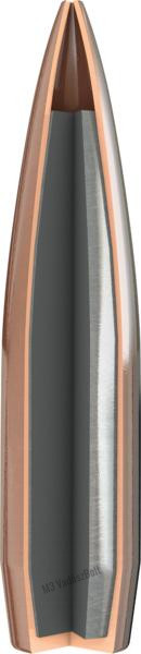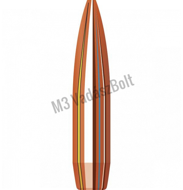 243Win (6mm) Hornady Lövedék BTHP 105gr - Tradicionális, teljes köpenyes lövedék, amit a gyártó AMP technológiával is ellátott, így a mag és a köpeny szorosan illeszkedik, zár egymáshoz. A köpeny fala egyenletes vékonyságú, így röppályája is megbízhatóan lapos, a lövedék pontos.