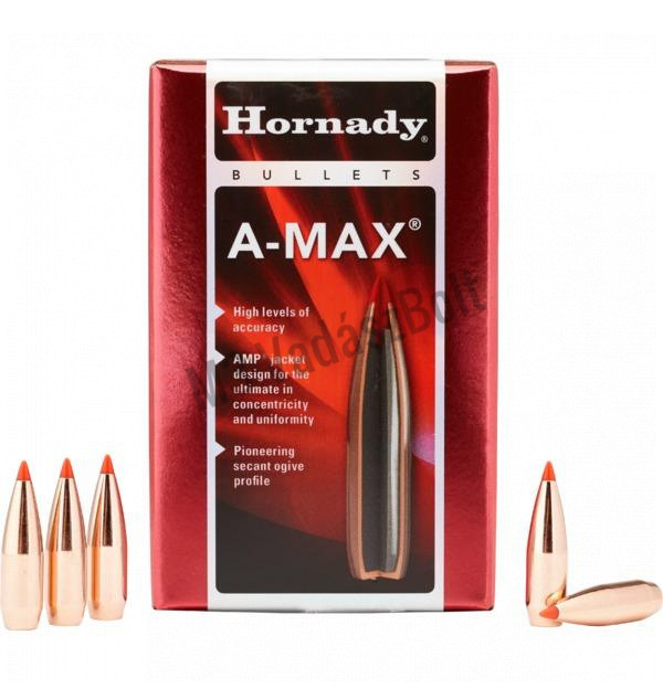 30. (7,62) Hornady Lövedék A-Max 168gr - Az A-Max lövedék a pontlövők számára lett kialakítva. A roppant pontos, lapos röppályájú, ólommagos, rézköpenyes lövedéket hegyes, hőálló polimer heggyel látták el, ezzel téve még megbízhatóbbá.