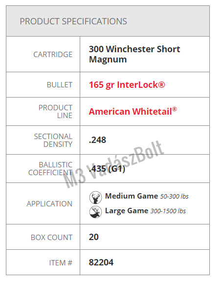 300 WSM InterLock American Whitetail 10.7g, 165gr - A széria, ami kimondottan nagytestű vad meglövésére készült. A nagy távolságokon is kitűnően teljesítő White Tail a szarvasvadászidény pótolhatatlan kelléke. A gyártó tradicionális ólomhegyű lövedéke. Kialakítása és anyagminősége egyenletes gombásodást és erős becsapódási energiát tesz lehetővé. A Hornady InterLock technológiának köszönhetően a lövedék köpenye és magja tökéletesen záródnak egymáshoz, így közvetítve tökéletesen minden energiát a becsapódás és a gombásodás során.