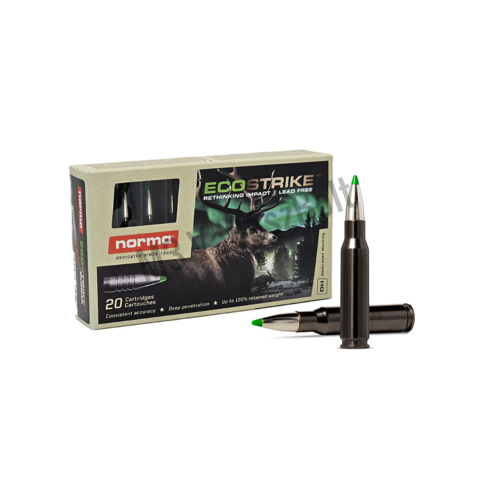 Az ECOSTRIKE™ az ólommentes lövedékek legfejlettebb gyártási technológiával készül réz és nikkel ötvözetéből. A műanyag hegy elősegíti a gombásodást és csökkenti a légellenállást, míg a csónakfar kialakítás növeli a ballisztikai együtthatót, valamint a majdnem 100%-os súlymegtartás biztosítja a nagy átütőerőt. A lövedék becsapódáskor sziromszerűen szétnyíló elülső része megfelelő sebcsatornát képez, mindezeknek köszönhetően a lövedék megfelelő ölőerővel rendelkezik. A nikkel bevonat elősegíti a fegyvercső hosszú élettartamát.