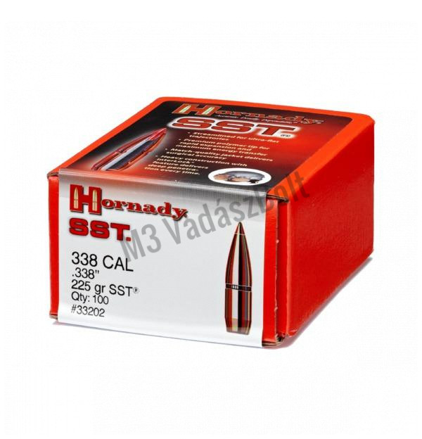 338 Hornady Lövedék SST 225gr - A Hornady SST úgy lett kialakítva, hogy a lehető legnagyobb traumát okozza becsapódáskor, gyorsan gombásodjon, főleg nagy sebesség esetén. Lapos röppályájának köszönhetően roppant pontos, kiváló választás nagytestű állat vadászatára, hiszen hatalmas sebesülést képes okozni.