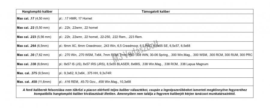 A fenti kaliberek felsorolása nem tükrözi a piacon elérhető teljes kaliber választékot, csupán a legnépszerűbbeket ismerteti megkönnyítve fegyveréhez kompatibilis hangtompító kaliber kiválasztását illetően. Amennyiben nem találja a fegyvere kaliberjét kérjen tanácsot munkatársainktól.