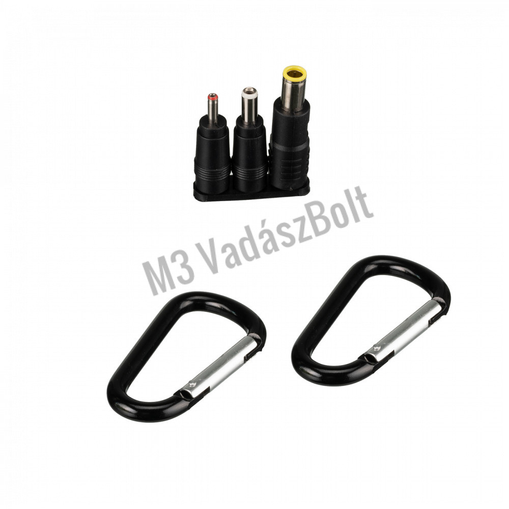 napelem panel, 2 db karabiner, DC csatlakozókábel, 3 db csatlakozó adapter, használati utasítás