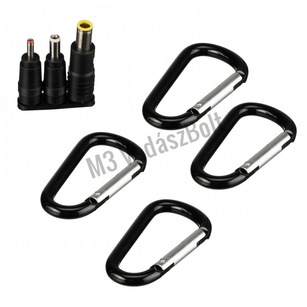 napelem panel, 4db karabíner, Dc csatlakozókábel, 3db csatlakozó adapter, használati utasítás