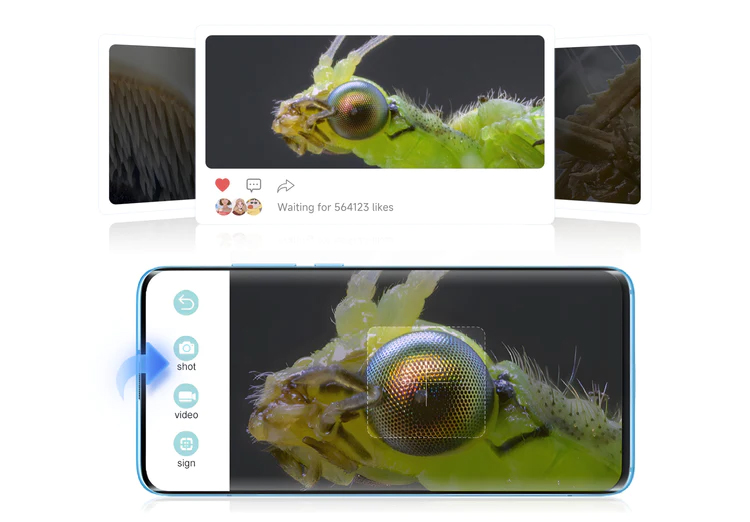 A mikroszkóp tubusán lévő gomb megérintésével vagy a kijelző képernyőjén lévő kamera/videó ikonra kattintva könnyedén készíthetsz fényképeket vagy rögzíthetsz videókat valós időben. Az egykattintásos rögzítés funkcióval soha nem maradsz le egyetlen kiváló pillanatról sem!