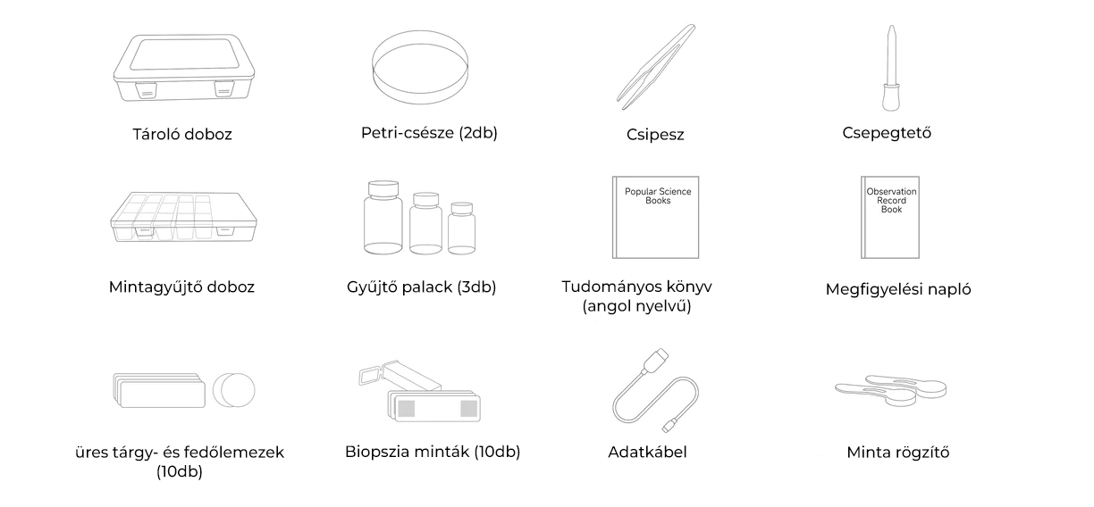 mikroszkóp; 10 db üres tárgy- és fedőlemez; mintagyűjtő eszközkészlet; tudományos könyv (angol nyelvű); megfigyelési napló; adatkábel
