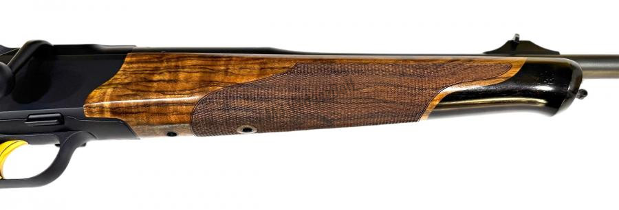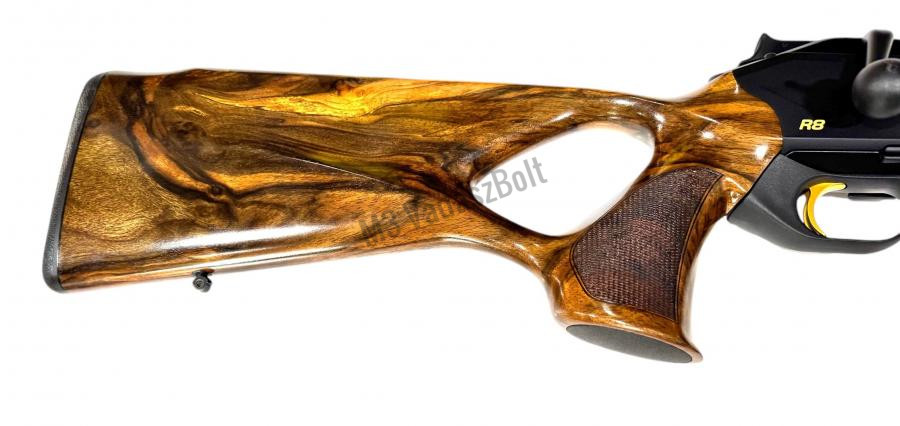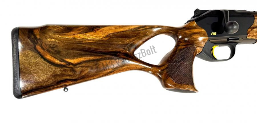 A Blaser R8 Success a vadászfegyverek prémium kategóriájának kiemelkedő darabja, amely az eleganciát, a precizitást és az ergonómiát egyesíti. A fegyver tusa gondosan válogatott 7-es kategóriás kaukázusi diófából készült és fekete ébenfa záródíszítéssel egészül ki az előagyvégződésen és a pisztolymarkolaton. Az ergonomikus kialakítású, thombhole tusa nemcsak kényelmes fogást biztosít, hanem segíti a természetes, stabil kéztartást is, ami pontosabb lövést eredményez. A pofadék dupla élű kialakítása és a 15 mm-es gumiagytalp további komfortot és stabilitást nyújt, megakadályozva a fegyver lecsúszását a vállról. A rendszerkamra selyemfekete könnyűfémből készült, amelyet arany színű „R8 Success” felirat díszít, harmonizálva az aranyozott zárfejjel és elsütőbillentyűvel. A fegyvercső 17 mm átmérőjű, nyílt irányzékkal szerelt.