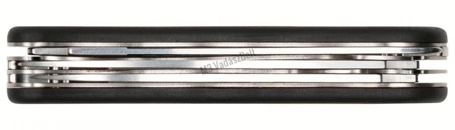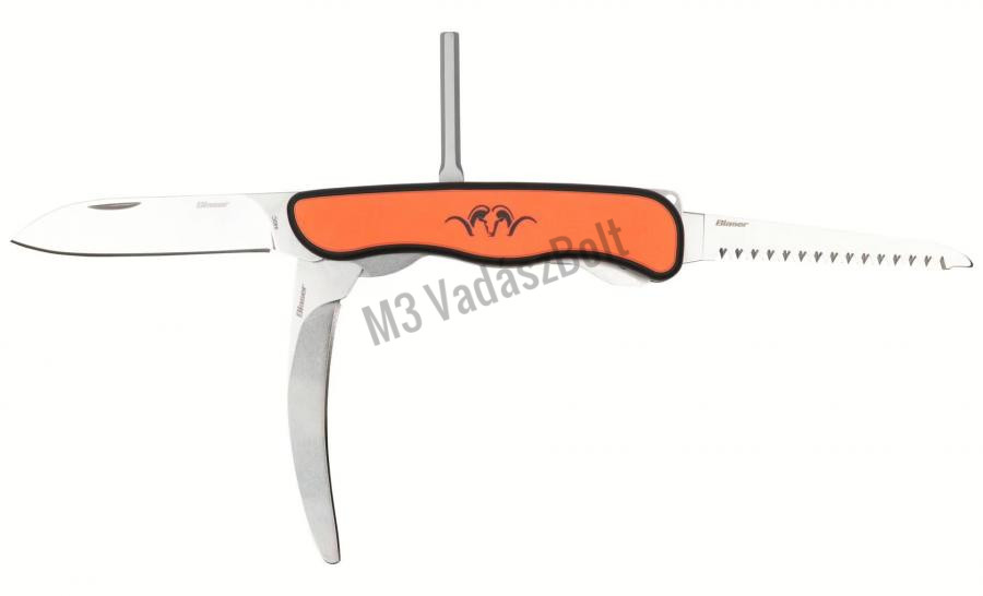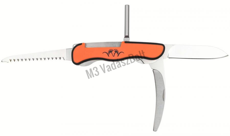 A Blaser multitool bicska egy sokoldalú, kompakt eszköz, amelyet kifejezetten vadászati felhasználásra terveztek. Egyetlen kézben egyesíti a legfontosabb zsigerelési és terepi funkciókat, így ideális választás vadászathoz, túrázáshoz és általános kültéri használatra is. A fekete–narancs színösszeállítás jól látható és karakteres megjelenést biztosít. A multitool 440C minőségű rozsdamentes acél pengékkel készül, amelyek kiváló élmegtartást, nagy szilárdságot és korrózióállóságot biztosítanak. A készlet tartalmaz egy normál pengéjű zsebkést, egy lekerekített végű zsigerelő pengét, amely biztonságosabb felhasználást tesz lehetővé, valamint egy összecsukható fűrészt ágak vagy kisebb csontok vágásához. A beépített SW5-ös imbuszkulcs különösen praktikus, például Blaser R8 fegyvercsövek cseréjéhez. A könnyen tisztítható, nedvességálló kialakítás és a strapabíró műanyag markolat megbízható használatot biztosít változatos körülmények között is. A multitool kompakt méretének és alacsony súlyának köszönhetően kényelmesen hordozható, a mellékelt nylon tok pedig biztonságos tárolást és szállítást tesz lehetővé. A Blaser multitool bicska ideális választás azok számára, akik egy megbízható, többfunkciós és vadászatra optimalizált eszközt keresnek.