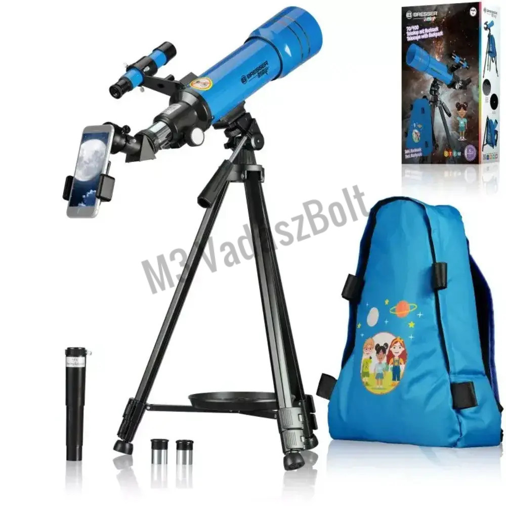 A hátizsákkal ellátott BRESSER JUNIOR 70/400 refraktor teleszkóp kiváló választás bárki számára aki el kíván indulni saját csillagászati ​​felfedezőútjára. A 70 mm-es rekesznyílás és 400 mm-es fókusztávolság révén a teleszkóp számos lenyűgöző égi objektumot képes a megfigyelő elé tárni. A teleszkóp tartalmaz mindent ami a kezdéshez szükséges: 3 féle okulár, egy diagonális tükör, egy 1,5-szeres lencse, egy keresőtávcső és egy okostelefon adapter.