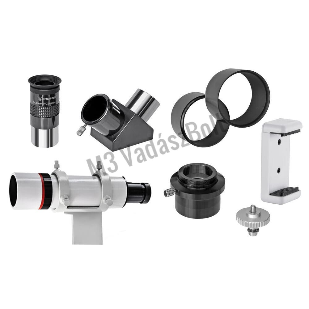 napszűrő, 26 mm Plössl szemlencse, 31,7 mm diagonális tükör, 8x50 keresőtávcső, okostelefon adapter