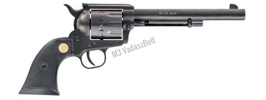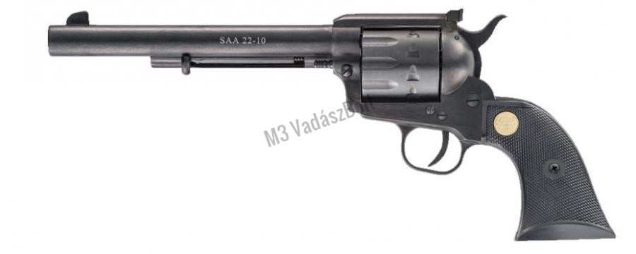 Chiappa 1873 SingleActionArmy 22-10 revolver .22LR - A vadnyugat szerelmeseinek! Azok a lövészek, aki rajonganak a western stílusért, igazán örülhetnek, ugyanis a Chiappa 1873 SSA kialakításában és működési elvében is teljes mértékig megegyezik az eredeti modellel. A klasszikus forma része a vágtázó ló sörényét idéző kakas, a széles, cápauszony alakú első irányzék és a cilinder és markolat távolságának megfelelő kialakítása. Ezt a modellt hosszú, 7,5' csővel látták el.