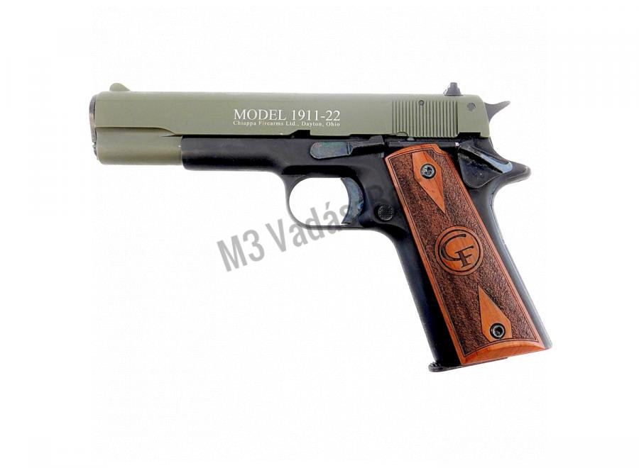 Chiappa 1911 Pistol .22LR OD-Green 5' Hogue markolattal - A piacon eddig nehezen elérhető volt a kis kaliberű klasszikus, letisztult formájú M1911s modell. Nem hiába vált a pisztoly sokak kedvelt lőfegyverévé, és a hobbi valamint kezdő sportlövészek számára kitűnő választás .22-es kaliberben. Ezt a modellt OD (zöld) festéssel látták el.