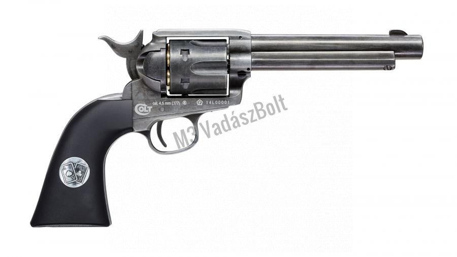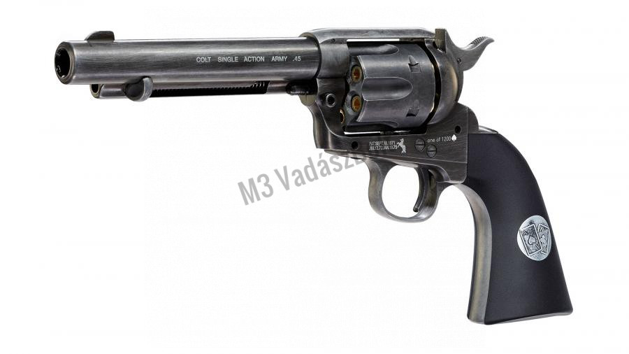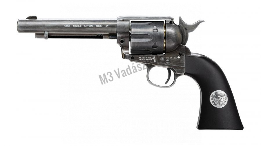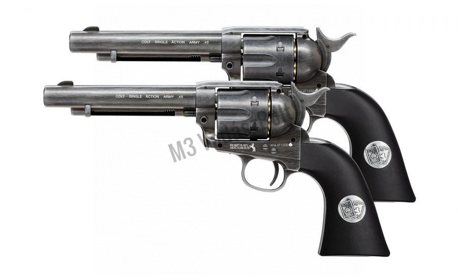 A Colt Single Action Army revolvert az amerikai szolgálati revolverek pályázatára készítették, melyet meg is nyert, így lett rendszerbe állítva a hadseregben és a rendvédelemben is 1872-ben. A pisztoly elképesztő népszerűségnek örvendett a civil szférában is, számos marhatenyésztő, (cowboy) fejvadász, és bandita jobb kezévé vált rövid időn belül. A Colt Single-Action Army a Schofield revolverrel együtt került rendszeresítésre, a Colt-ot főleg a lovasság kapta, de hamar rájöttek, hogy gyakorlatilag bárhol megállja a helyét. A revolver számos ismert és hírhedt ember nevéhez köthető, mint például George S. Patton tábornok, vagy Buffalo Bill. A .45-ös Colt légfegyver változata CO2 patronnal működik, forgótárjába 6 db 4,5 mm-es lövedék tárazható. A revolver érdekessége, hogy a BB golyót az eredeti lőszerhez hasonló hüvelyekbe kell behelyezni, mely növeli a fegyver valósághű megjelenését és a szórakozás örömét. A Colt Single Army többféle kivitelben készül, létezik belőle fekete, nikkel és antikolt változat is. A mesterien készült replika apró részleteiben is hasonló az eredeti fegyverhez, mivel teljesen fémből készült súlyra is megegyezik az igazival. Az Umarex limitált kiadása, a Dupla Ászok, egy soha vissza nem térő, 1200 darabszámban forgalomba hozott pisztolypár, kifejezetten gyűjtők részére. A szett tartalma két darab teljesen egyedi festéssel, gravírozással és markolattal készült Colt .45 Single Action Army revolver, 24 darab shell, és egy pakli egyedien nyomott kártya. A pisztoly markolatpaneljein is a "dupla ászok" gravírozása látható.