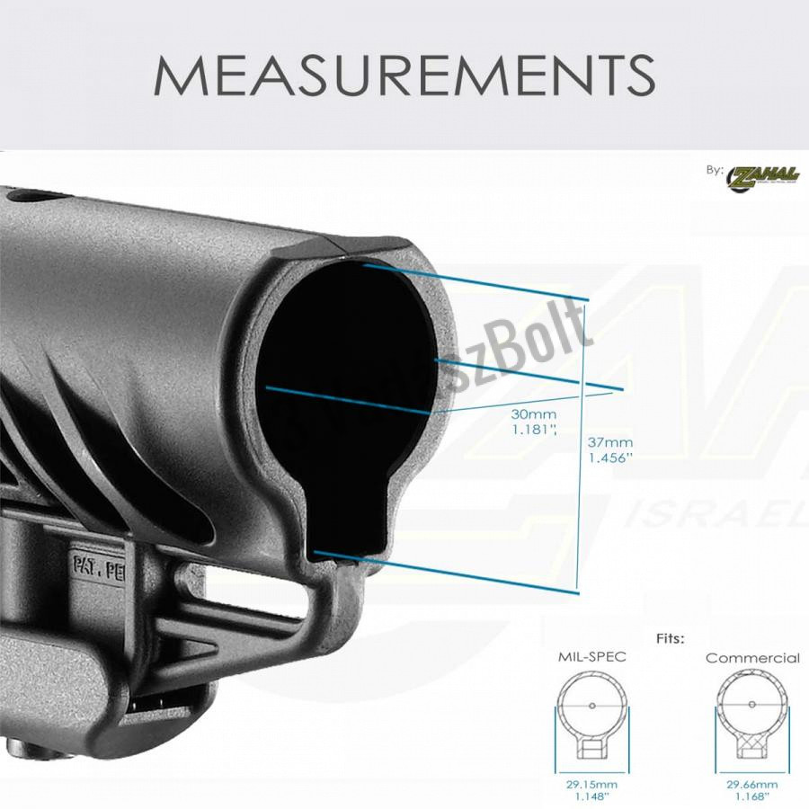- Egyedülálló szabadalmaztatott „Anti-Rattle” mechanizmus, tökéletesen illeszkedik a MIL-SPEC és a kereskedelmi forgalomban kapható puffercsövekhez