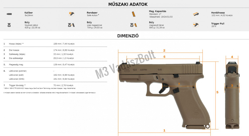 EZÉRT ÚGYMOND A G19X EGY KATONAI MODELL, NEM CSAK A FEGYVER SZÍNE MIATT, DE A MARKOLAT KIALAKÍTÁS NEM AZ ÁLTALÁNOS GEN5 TÁRTÖLCSÉRES, HANEM AZ ESETLEGES AKADÁLYOK ELHÁRÍTÁSÁT KESZTYŰBEN IS LEHETŐVÉ TEVŐ SZÉLESEN KIVÁGOTT MARKOLAT, GYÁRILAG TRÍCIUMOS IRÁNYZÉK, ILLETVE EZ AZ EGY TÍPUS AMIHEZ A GLOCK GYÁRILAG 3 TÁRAT AD, 2 DB 19-ES KAPACITÁSÚ NÖVELT, ÉS 1 DARAB 17ES KAPACITÁSÚ NORMÁL TÁRAT.