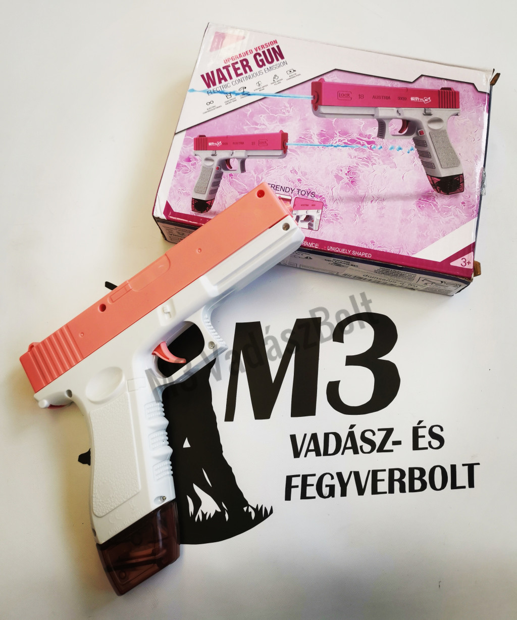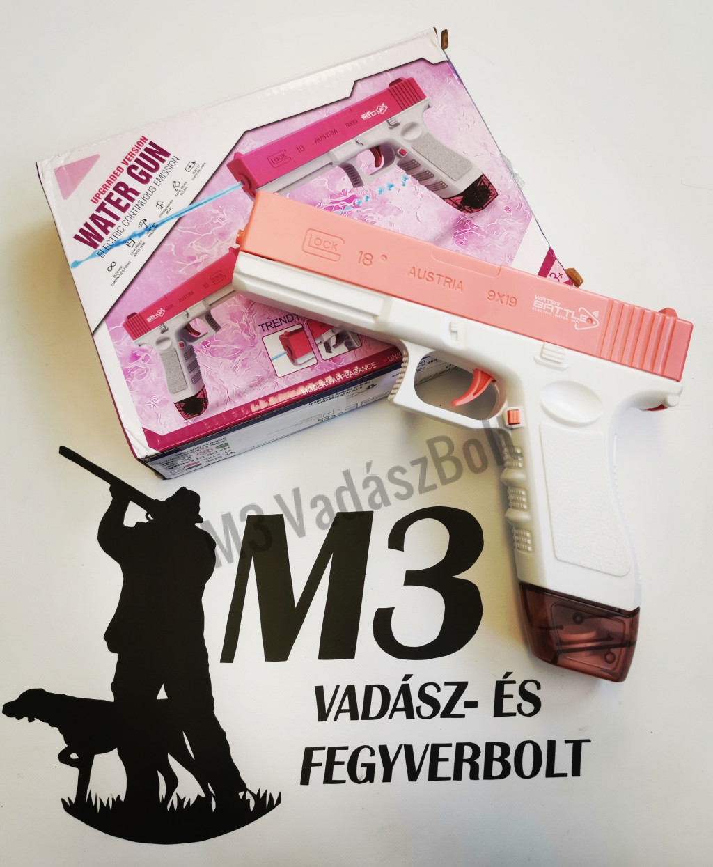 Glock formájú Vízpisztoly, elektromos, 20,5 x 16 x 3 cm, rózsaszín és kék színben raktáron.