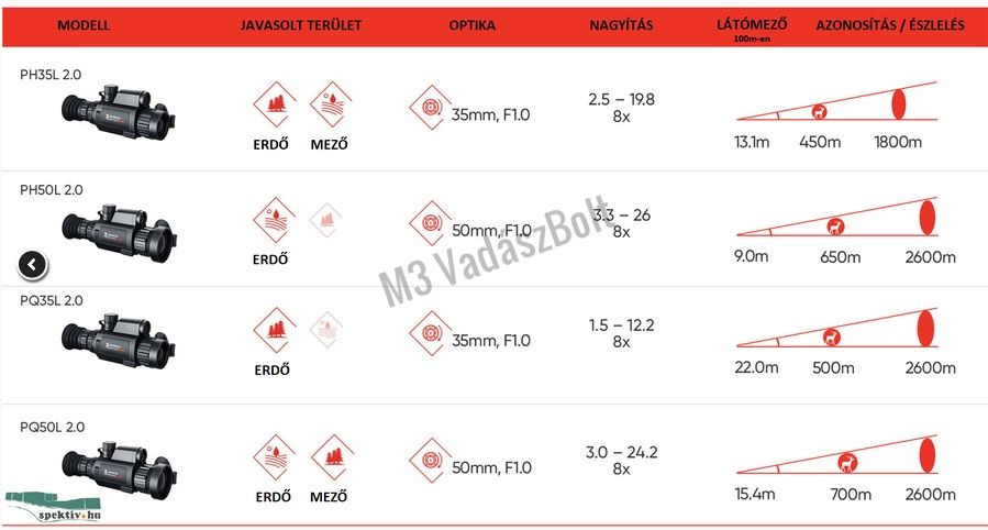 • 35mm-es  objektívnek, és az új, 12 mikronos érzékelőnek  köszönhetően, egy emberi alak, vagy egy szarvas akár 2600 méterről észlelhető.( 3 pixel)