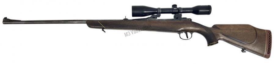 A ZKK600 egy klasszikus, megbízható szerkezetű, cseh gyártmányú ismétlő golyós vadászpuska a népszerű .30-06 Spring. kaliberben. Masszív acélszerkezete és elegáns diófa tusa miatt a típus évtizedek óta kedvelt választás a vadászok körében. Ez a példány használt, de jó állapotú, minimális hibával a tuson (a fotókon látható módon). A tuson kisebb használati nyomok, felületi karcok előfordulnak, de szerkezeti sérülés nincsen. A fémrészek felületkezelése szép, a cső és a zár egyaránt műszakilag ép, működése sima és pontos. A ZKK600 típus jellemzői közé tartozik a kiváló pontosság, az erős és precíz zármechanizmus, valamint a kényelmes markolat és előágy maratás, ami biztos fogást nyújt terepi használat során is. A cső hossza körülbelül 600 mm, a tár kapacitása 3 lőszer.