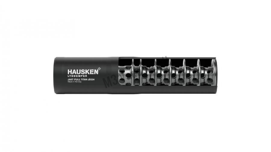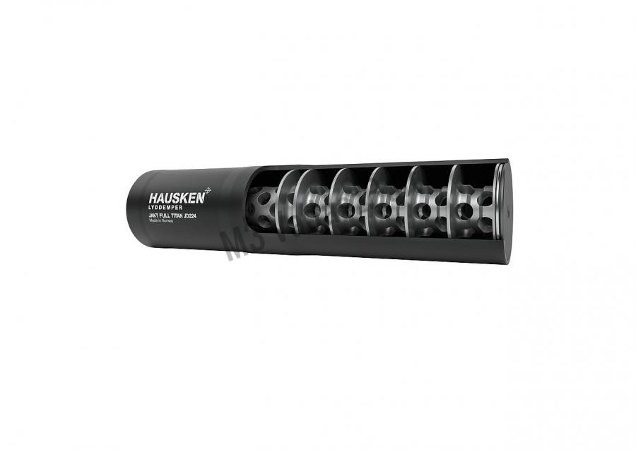 A Hausken JD224FTi — Full Titan 224 egy 100% titánból készült, prémium kategóriás hangtompító, amely kiemelkedő tartósságot és magas csillapítási képességet kínál. Kompakt, könnyű kivitele (507 g) megőrzi a fegyver egyensúlyát még dinamikus helyzetekben is, ezért ideális választás lövészetre, vadászkörülményekre (pl. drückjagd) és intenzív használatra, ahol fontos a megbízhatóság és a minimális tömeg. A fekete titán felület elegáns megjelenést és kopásállóságot biztosít. Az új JD224Ti szintén a jól bevált Hausken „Over-barrell„ kialakításra épül, így a felcsavarozott hangtompítóval ellátott puska teljes hossza mindössze 14 cm-rel növekszik, és a vadász még mindig jól kezelhető puskával rendelkezik.