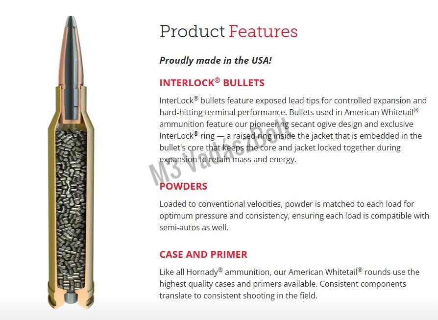 A Hornady American Whitetail lőszer kifejezetten nagyvad vadászatra lett kifejlesztve. A klasszikus 139 gr súlyú InterLock Soft Point (SP) lövedék megbízható expanziót és nagy energiaközlést biztosít, így ideális választás szarvasfélékre, különösen őzre és gímszarvasra. Az InterLock technológia biztosítja, hogy a lövedék köpenye és magja lövés közben is együtt maradjon, ezáltal mély behatolást és hatékony sebzést eredményez. A 7mm-08 Remington kaliber kiváló pontosságáról és kiegyensúlyozott ballisztikai tulajdonságairól ismert, így kezdő és tapasztalt vadászok számára egyaránt ideális választás.