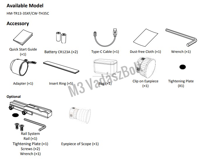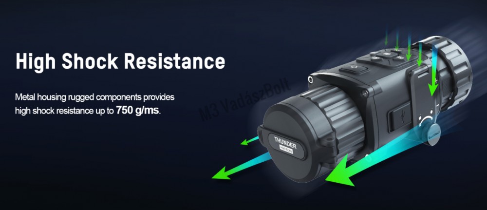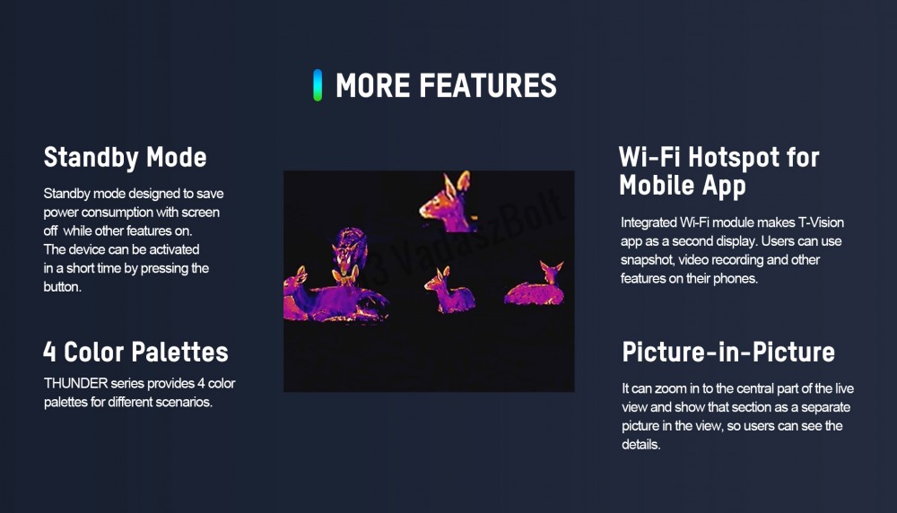 A nagy méretű, 1024x768 képpont felbontású OLED kijelző kontrasztos és éles képet vetít, és akár mínusz harminc Celsius fokos hidegben is működőképes marad. A fém készülékháznak és a gondos tervezésnek köszönhetően a készülék lövésállósága biztosított akár 750 g/ms terhelés esetén is. Ötféle választható szálkereszt háromféle választható színben, PIP funkció, Wi-Fi hotspot, állókép és videó felvétel  menthető 16Gb belső memóriába. Mindez Magyar nyelvű menüvel programozható. 3 év teljes körű gyári garancia + 7 év az érzékelő lapkára.