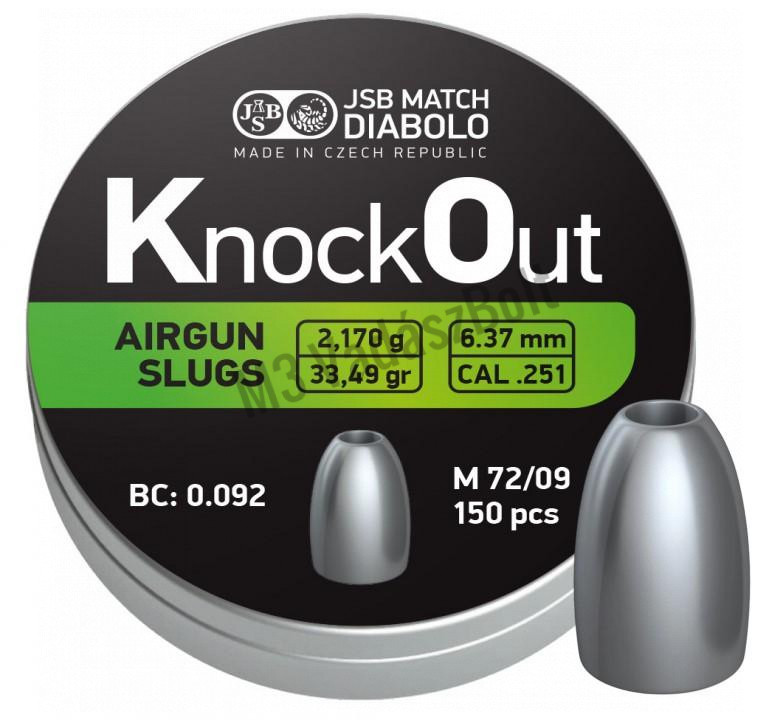 A JSB Knock Out Slug-ot a sörétes puskákban is használatos brenneke, avagy Slug lövedék ihlette, mely nagy súlyával elképesztően nagy energiát képes leadni a célponton, lényegében kiütve azt. Ezt a lövedéket a JSB kimondottan PCP légpuskákba szánta, a feje üreges, így becsapódáskor felgombásodik, teljes energialeadásra késztetve magát a lövedéket.