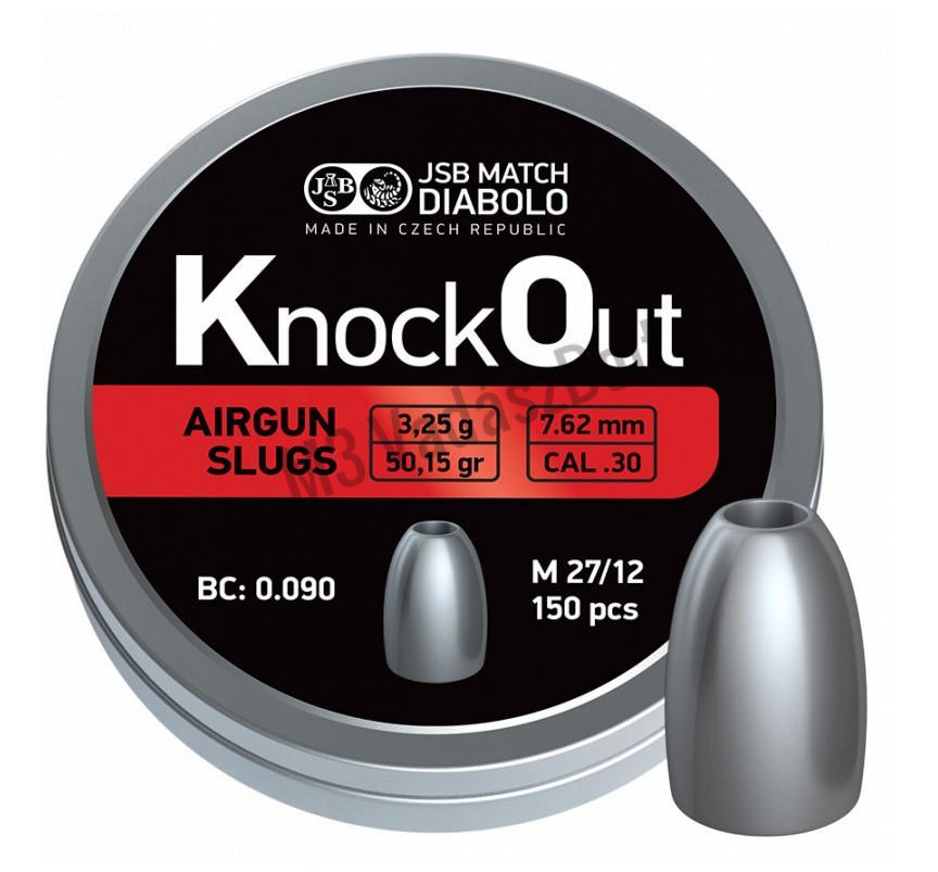 A JSB Knock Out Slug-ot a sörétes puskákban is használatos brenneke, avagy Slug lövedék ihlette, mely nagy súlyával elképesztően nagy energiát képes leadni a célponton, lényegében kiütve azt. Ezt a lövedéket a JSB kimondottan PCP légpuskákba szánta, a feje üreges, így becsapódáskor felgombásodik, teljes energialeadásra késztetve magát a lövedéket. Formatervezése és kialakítása meglehetősen nagy pontosságot tesz lehetővé nagy távolságra, így kimondottan ajánljuk, az erősebb, 15 Joule feletti PCP légfegyverekbe!
