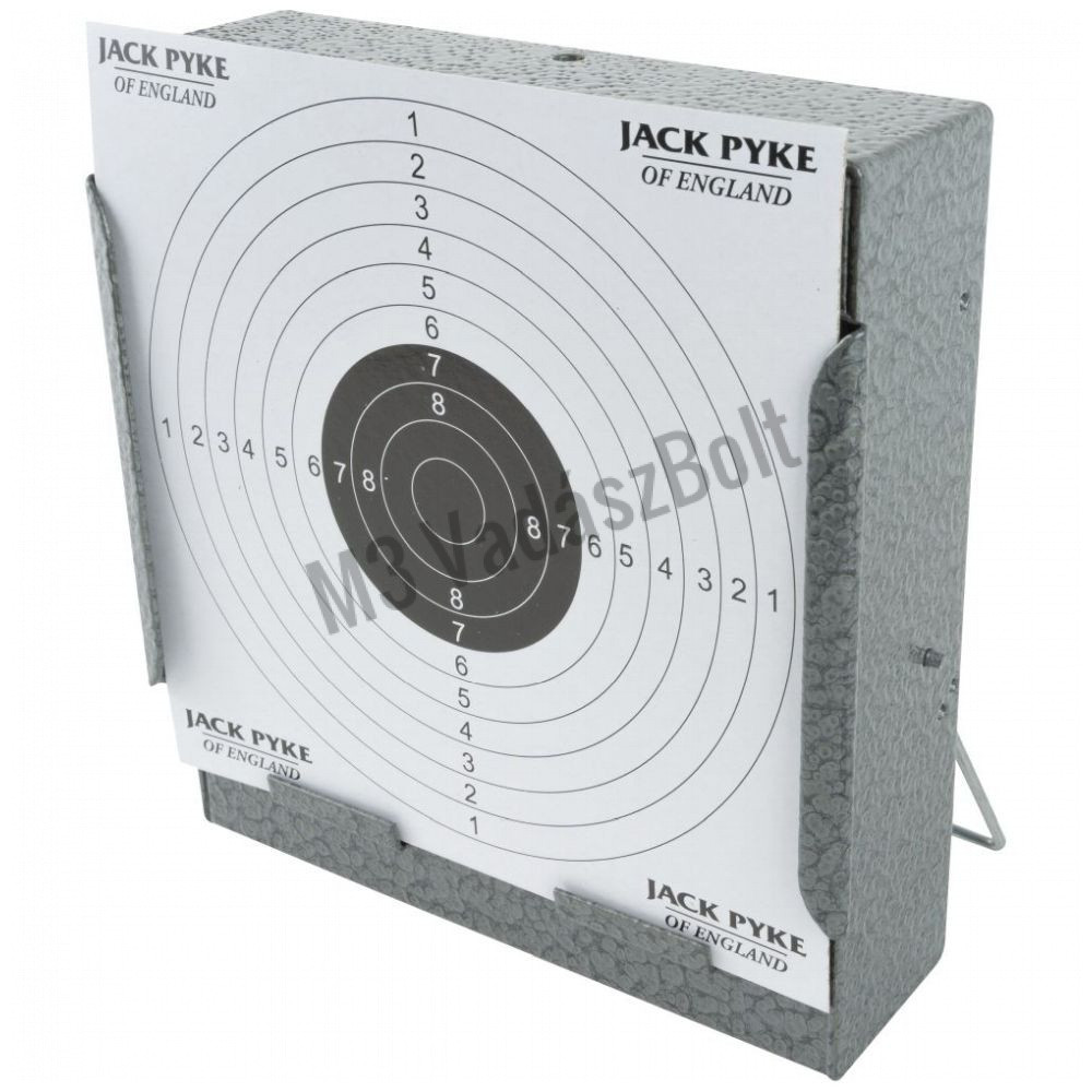 A Jack Pyke céltábla tartó egy horganyzott acél keret ferde hátlappal, amely csökkenti a lőszer visszapattanását, és gyűjti a lőszerhüvelyt.