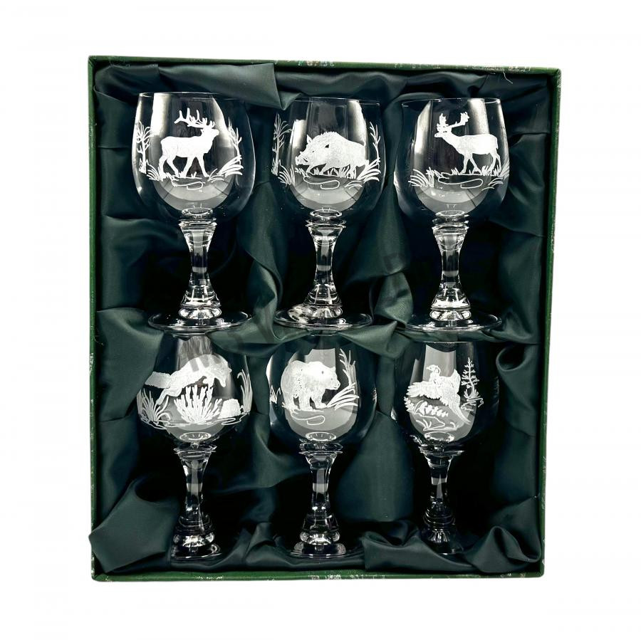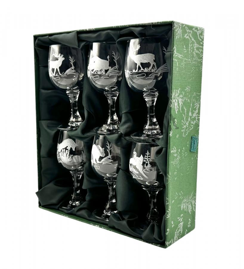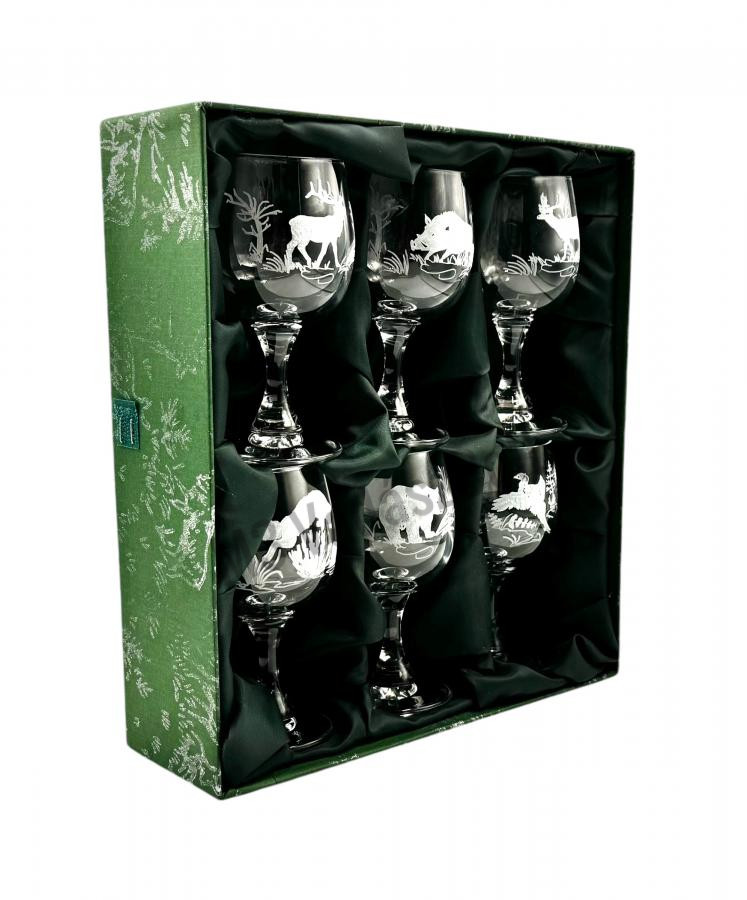 A borospoharak ergonomikus kialakítása és klasszikus formája lehetővé teszi a bor aromáinak és ízvilágának teljes kibontakozását, míg az átlátszó üveg kiemeli a bor színét és tisztaságát. Az elegáns gravírozott vadászati motívumok különleges hangulatot kölcsönöznek az asztalnak, tökéletes kiegészítői egy baráti összejövetelnek, családi vacsorának vagy ünnepi alkalomnak.
