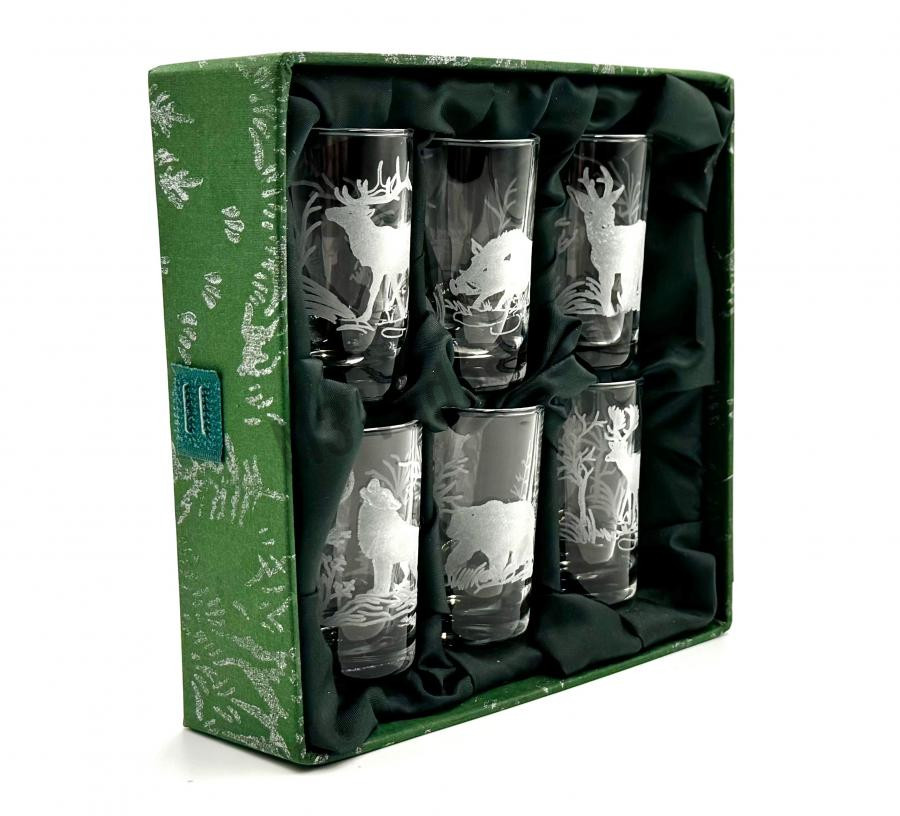 A Jägerglas gravírozott nagy stampedlis pohárkészlet egy exkluzív és elegáns italkészlet, amely tökéletes a röviditalok stílusos tálalásához. A készlet hat darab, magas minőségű üvegből készült, nagyobb űrtartalmú stampedlis poharat tartalmaz, amelyek gravírozott vadászati motívumokkal díszítettek. Ezek a finoman kidolgozott vadászati minták – például állatok, természet ihlette jelenetek vagy vadászjelenetek – egyedi és esztétikus megjelenést kölcsönöznek a poharaknak, emelve az italok fogyasztásának élményét.