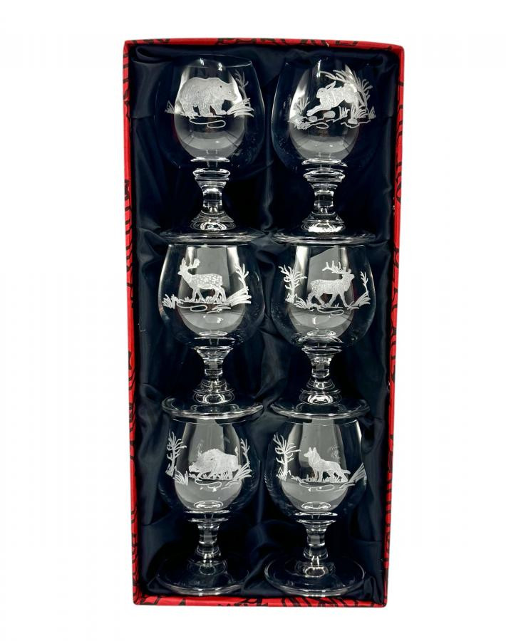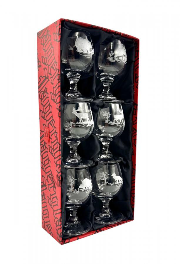 A Jägerglas gravírozott konyakos pohárkészlet egy elegáns és prémium minőségű készlet, amely tökéletes választás a konyak és más prémium italok stílusos felszolgálásához. A készlet hat darab kiváló minőségű üvegből készült konyakos poharat tartalmaz, amelyek egyedi, gravírozott vadászati mintázattal díszítettek. A finoman megmunkált gravírozás nemcsak esztétikai értéket képvisel, hanem egyedivé is teszi a poharak megjelenését.
