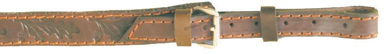 Nyomott tölgyfalevél mintás bőr fegyverszíj, hátoldalán filcrátéttel, fém csattal.<br />