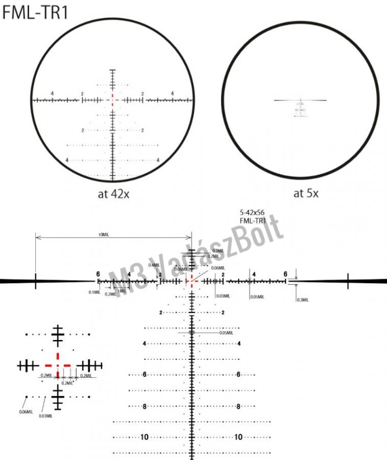 - Szálkereszt: FML-TR1 (MIL alapú, világítással)