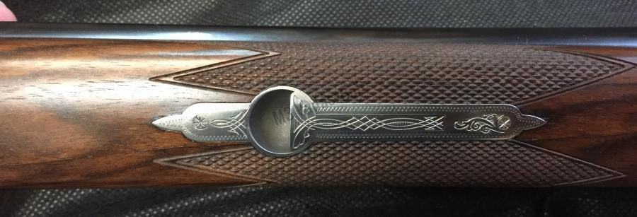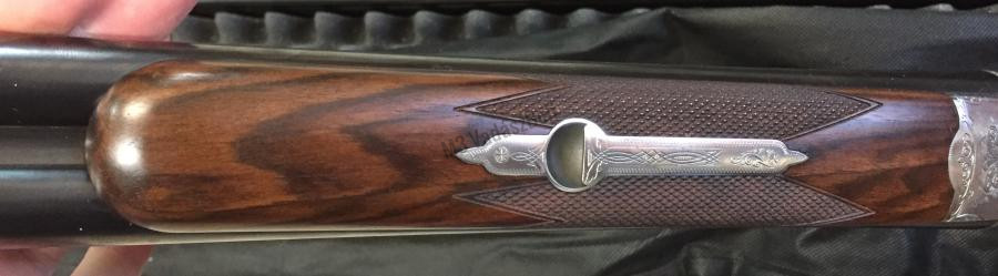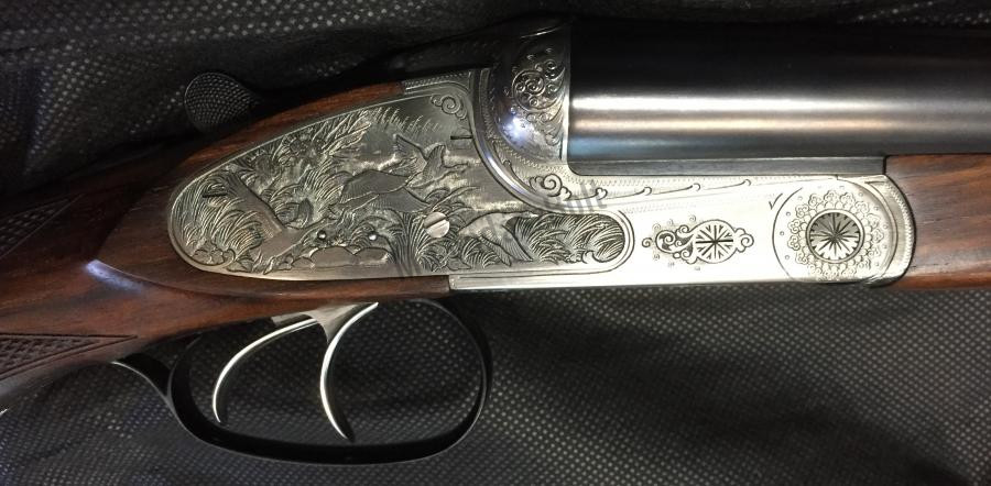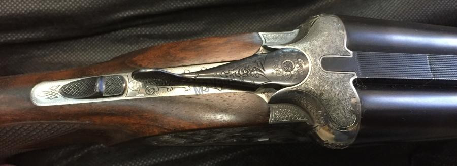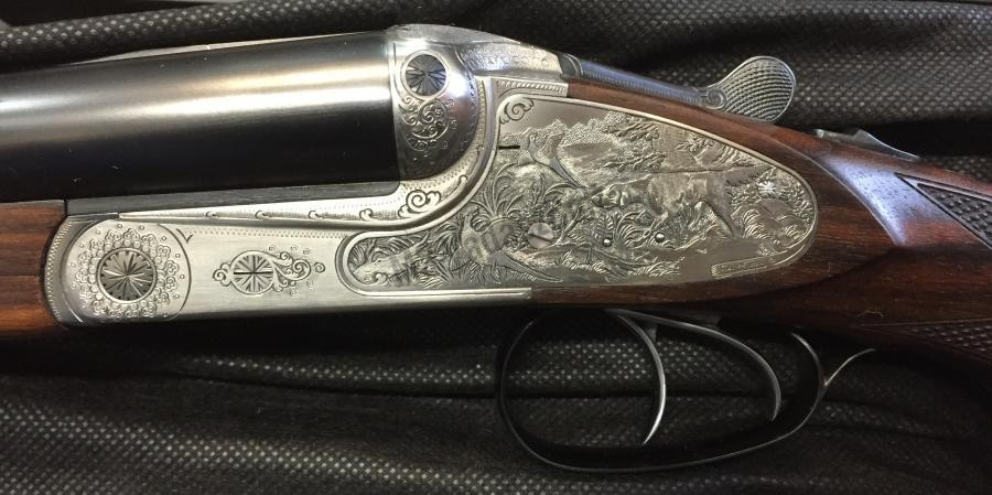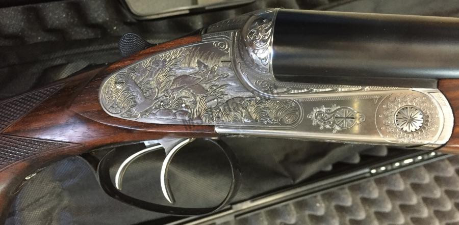 Merkel Mod. 60E exclusive kivehető oldallakatos dupla sörétes fegyver. kaliber 12/76, fix szűkítés 1/2- 1/1, 760mm-es csőhossz, Extra V. kategóriájú fa, Jagd ( Game Scene) vésés, nitritezett felületek, szíjkengyel, két elsütő billentyű.