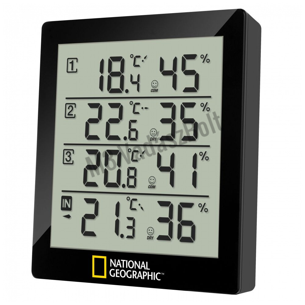 A National Geographic hőmérő és páratartalom mérő lehetővé teszi a hőmérséklet és a levegő páratartalmának mérését a házban vagy környékén; egyszerű megfigyeléssel egy helyen: Túl nedves a pincéje, és penész veszélyezteti?  A gyermekszobában minden rendben van? Túl meleg van a teraszon? 4 különböző terület adatait tudja leolvasni egyszerre, így pillantással!