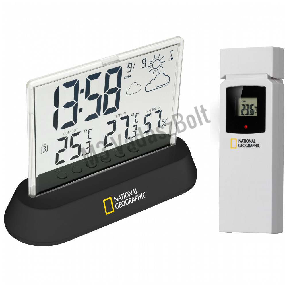 A National Geographic vezeték nélküli meteorológiai állomása mely egy futurisztikus, átlátszó kijelzővel és egy egyszerű és egyben elegáns állvánnyal rendelkezik, mindenki számára kiváló választás. A óra/idő mellett a kijelző folyamatosan egymás mellett mutatja a külső és a belső hőmérsékletet is. Az időjárás-állomás ébresztőóraként is használható, és alvás funkcióval is el van látva.