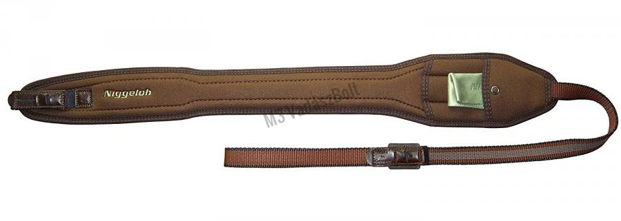 Niggeloh fegyverszíj, barna neoprén, zsebbel, lencsetörlő kendővel - Gyors állítású fegyverszíj. A széles és puha neoprén pánt roppant kényelmes, az anyag nyúlása korlátozott, de az esetleges rázkódást megfelelően tompítja. A belső oldalán a csúszásmentes felület stabilan a vállon tartja a fegyvert. A különösen széles pánt akár a puskát védő alátétként is szolgál és az anyag mozgása teljesen hangtalan. Ez a termék kiemelkedő kényelmet biztosít a többszörösen rétegelt neoprénnek köszönhetően szinte olyan, mintha egy légpárnát helyezne a vállára. A pánton kialakított zseb elválasztási lehetőséget nyújtanak 2 golyós és 1 sörétes lőszer elhelyezésére.