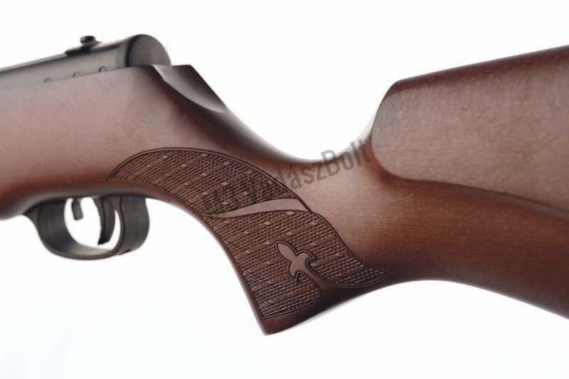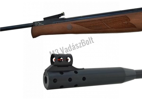 Norica Storm légpuska 4.5mm - Elegáns pofadékos fa tus halbőrözéssel, ventillált tusgumi, fiberszálas irányzék, automata biztosítás, kompenzátor, távcsőelőkészítés, állítható elsütőszerkezet.