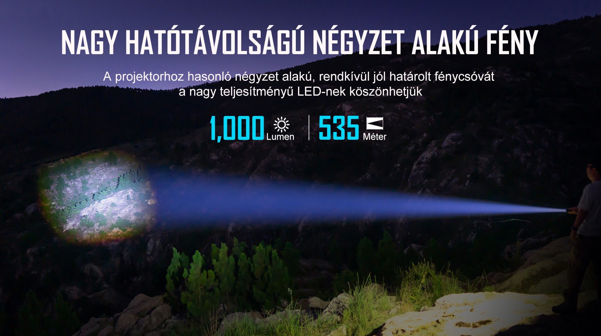 A projektorhoz hasonló, egyenletes és fókuszált négyzet alakú, rendkívül jól határolt fénycsóvát a nagy teljesítményű LED-nek és a két optikai lencsének köszönhetjük.