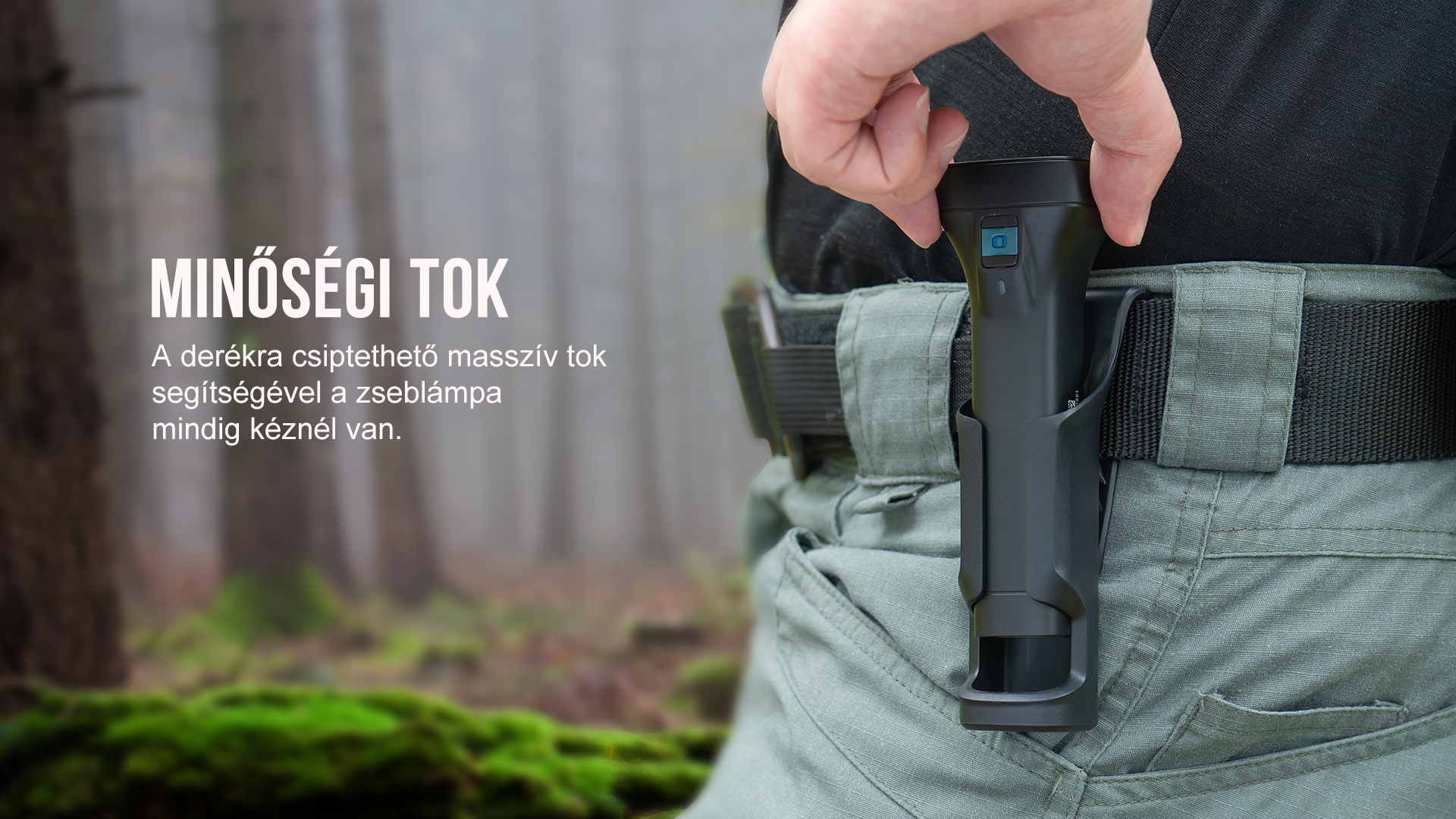 A derékra csiptethető, masszív tok segítségével a zseblámpa mindig kéznél van, és pillanatok alatt használatba helyezhető.