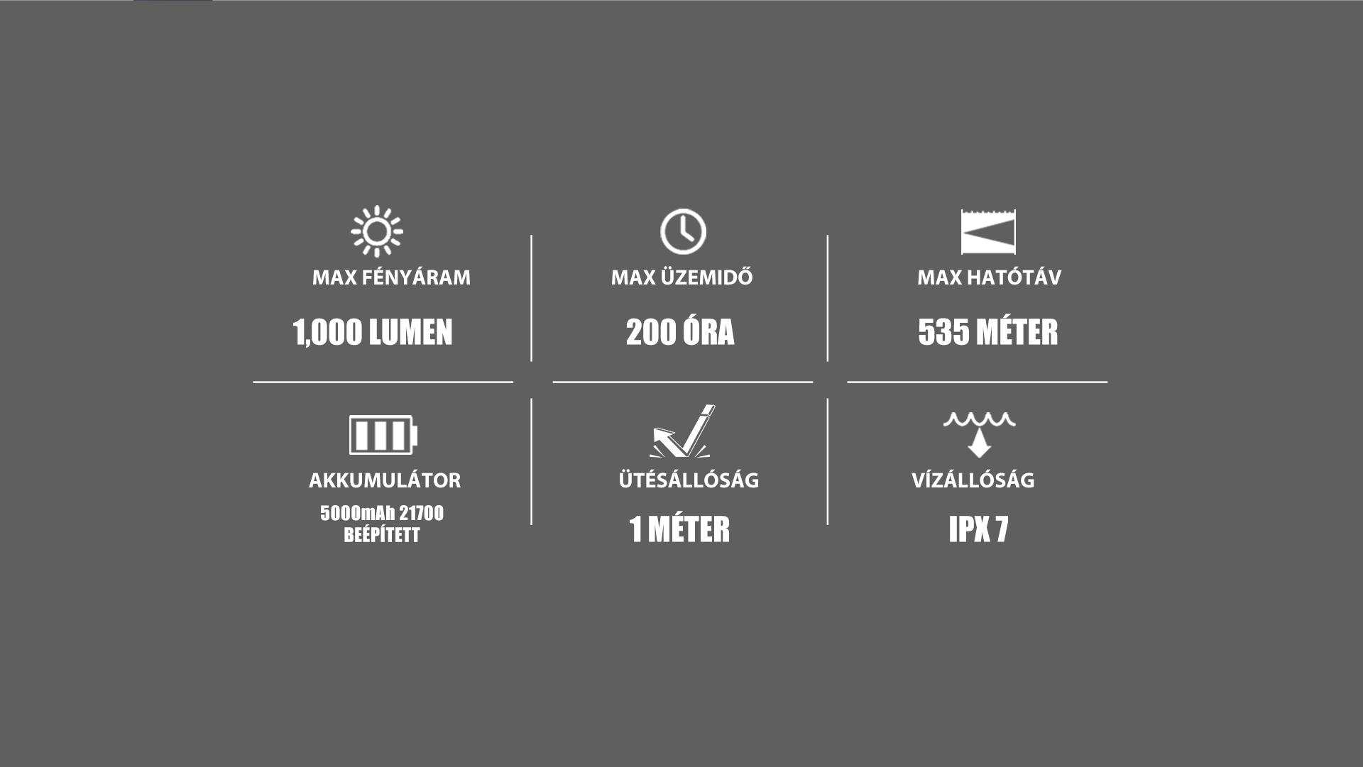 Turbo fokozat: 1000 lm - 1 perc, majd átvált: 470 lm - 160 perc, majd átvált 300 lm - 20 perc