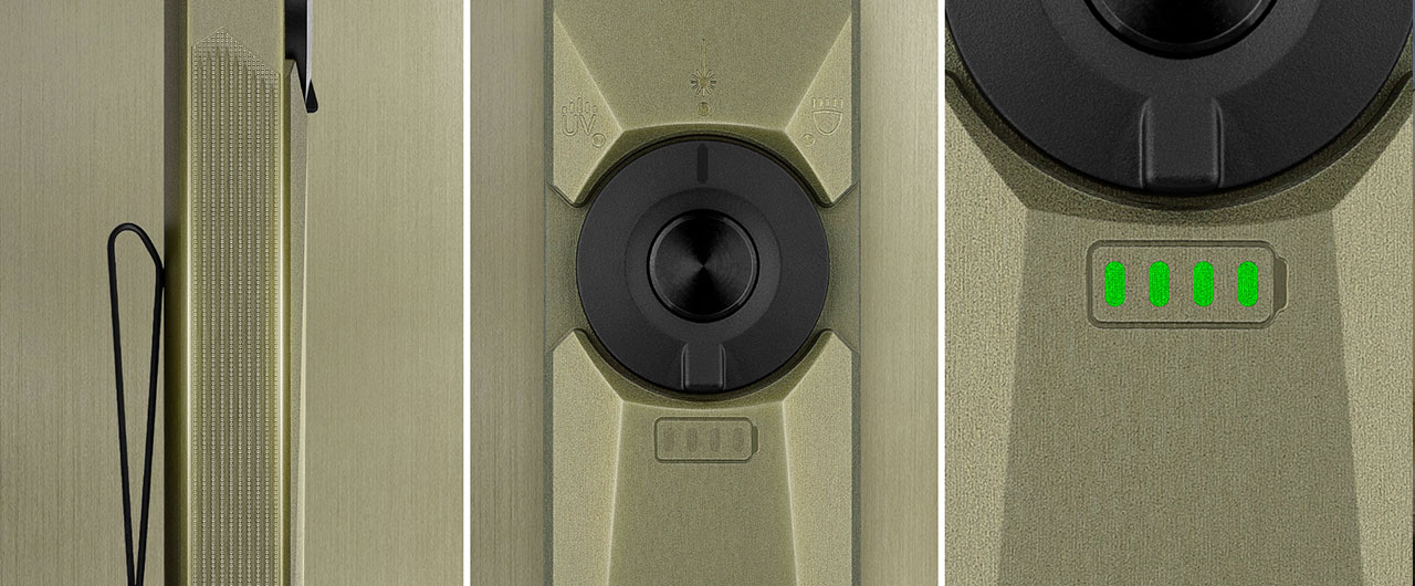 Az intuitív gombrendszerrel könnyedén válthatunk a LED fény, az UV és a zöld pointer között.