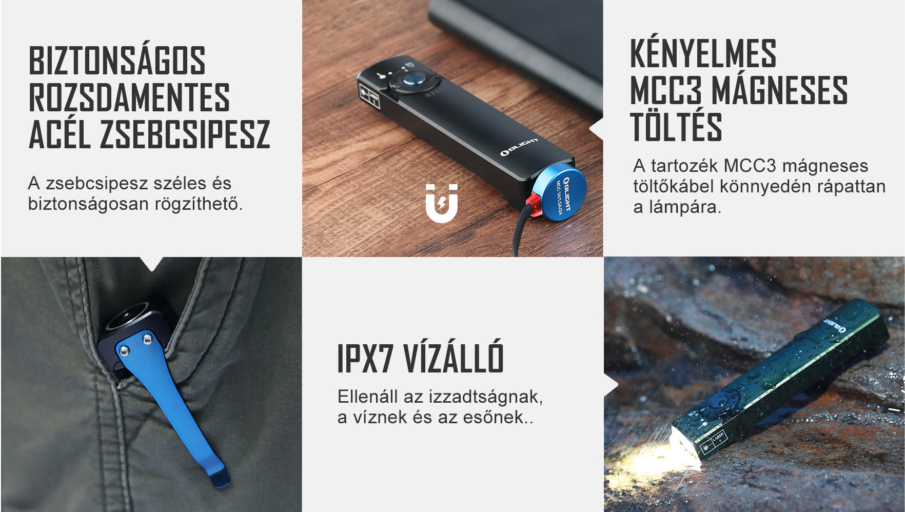 lámpa, 1050mAh-s beépített akku, övcsíptető, MCC3 mágneses töltőadapter USB csatlakozóval