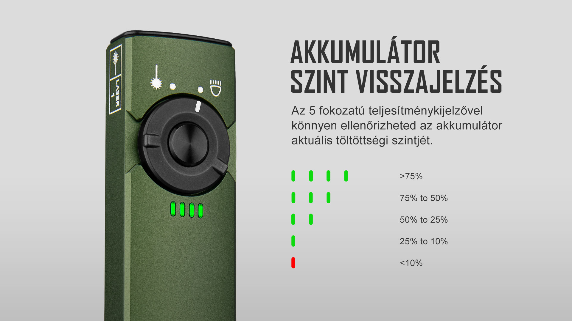 Az intuitív gombrendszerrel könnyedén válthatunk a LED fény és a zöld pointer között.