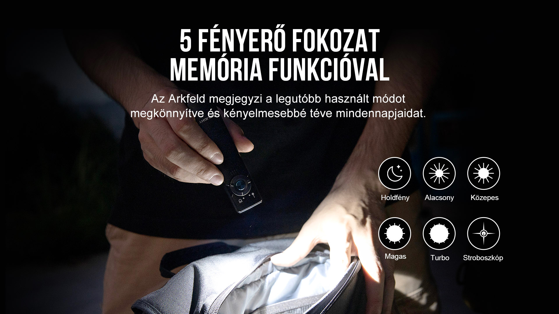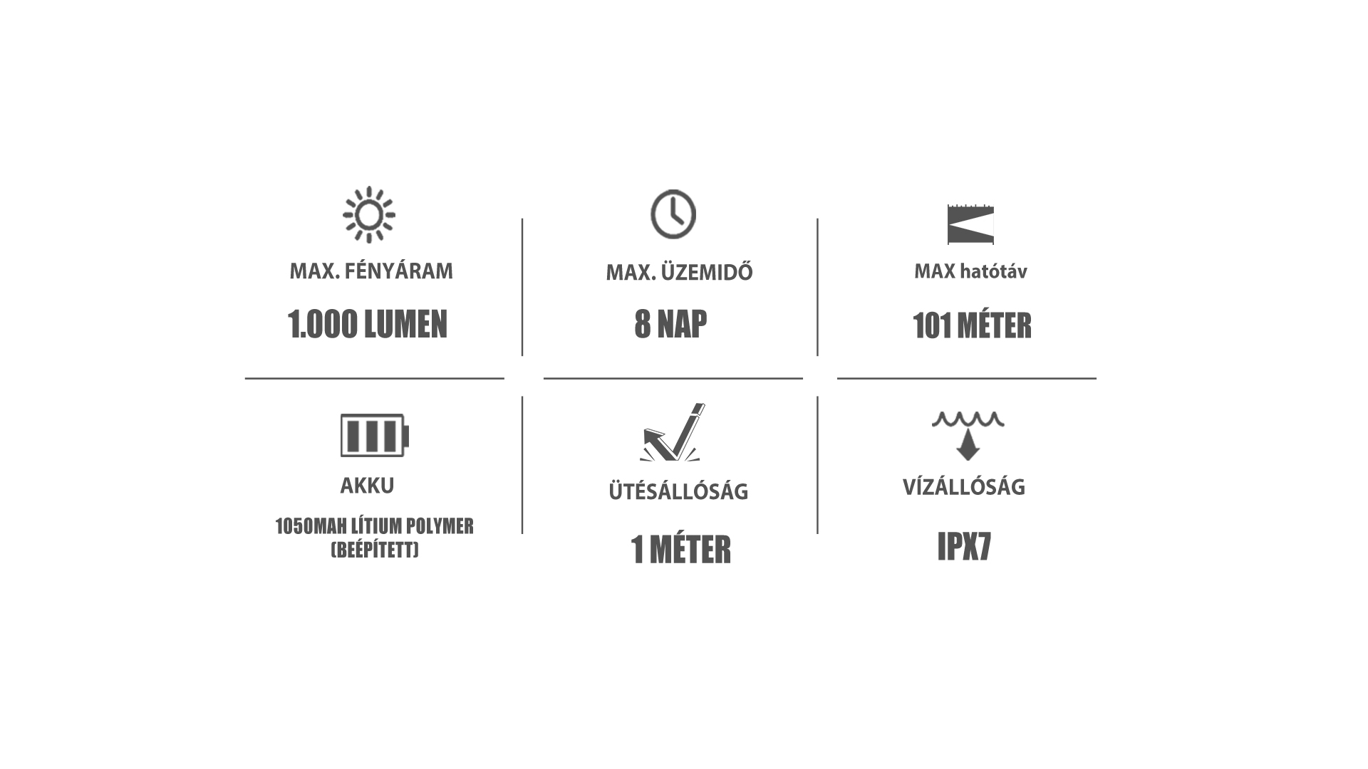 Turbo fokozat: 1000 lm - 1 perc, majd átvált: 470 lm - 160 perc, majd átvált 300 lm - 20 perc