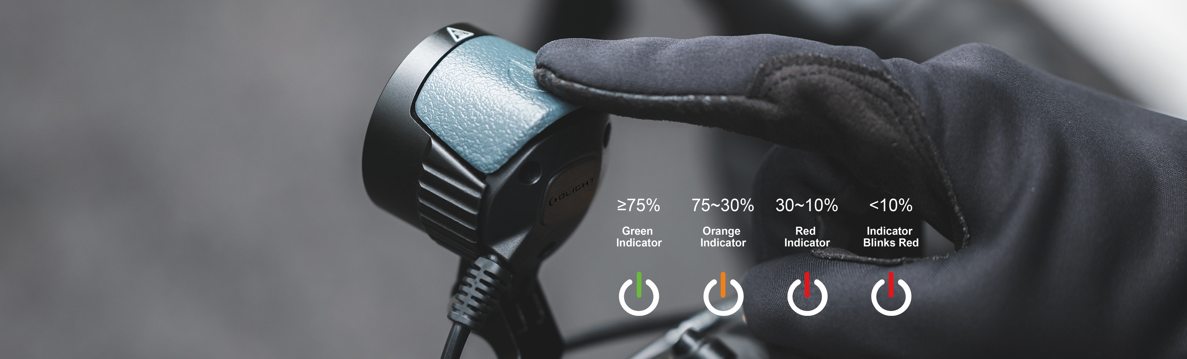A be-/kikapcsoló gomb lefedi a lámpafej tetejét, ezáltal kesztyűben is könnyen kezelhető. Továbbá visszajelzést kapunk az akku állapotáról.