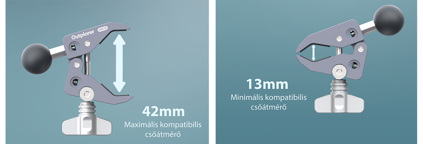 Az Outplorer kormányrögzítő minimális rögzítési távolsága (csőátmérő, amire rögzíteni kívánják) 13 mm, maximális 42mm. Így bármilyen felhasználási igényeknek megfelel.