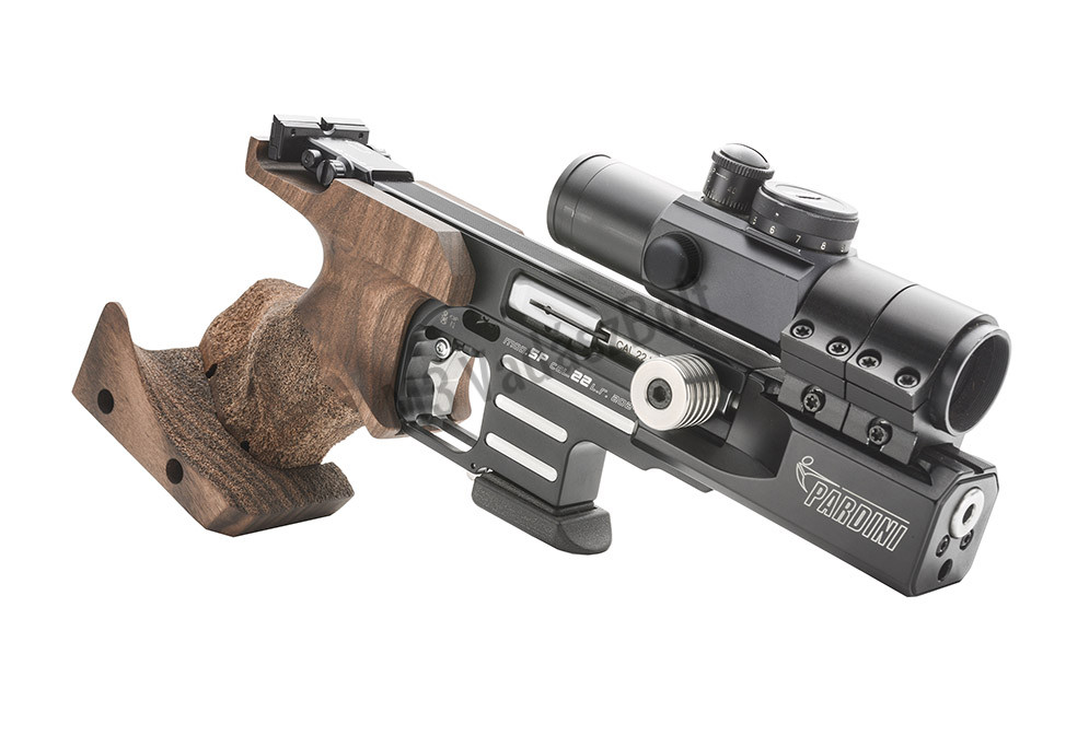 Szabad tömegzáras működésű Pardini SP .22 Long Rifle kaliberű sportpisztoly, melyhez 5 db-os kapacitású tár tartozik. A fegyver szánja magas minőségű acélból készült és beépített visszarúgás (a lövés során a lövész kezére ható erőhatás) csökkentő rendszerrel rendelkezik. A fegyver több ponton állítható direkt elsütéssel (two stage trigger) rendelkezik. Állítható hátsó és cserélhető (különböző magasságban és szélességben) első irányzékkal rendelkezik. 4 jobb és 3 balkezes ergonómikus markolatméretben rendelhető. Egyedi igény esetén kifejezetten a sportoló kezére készült markolattal is rendelhető. Köszönhetően beállíthatóságának, alacsony csőelrendezésének és a 6 csősúlyból álló rendszernek kényelmessé és jól használhatóvá tehető a fegyver szinte bármely lövész számára.